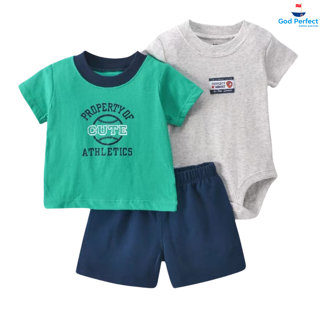 Conjunto Importado 3 Piezas Camiseta cuello redondo manga Sisa, mameluco manga Sisa y Bermuda corta con Estampado En tela liviana La tela es suave, transpirable e hipoalergénica. Proporciona frescura ideal para la piel del bebe.