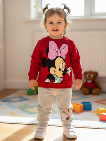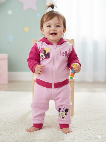 Set de 2 Piezas: Compuesto por una chaqueta con cremallera frontal y capota, junto a un pantalón tipo jogger a juego con un parche de Minnie en la pierna.