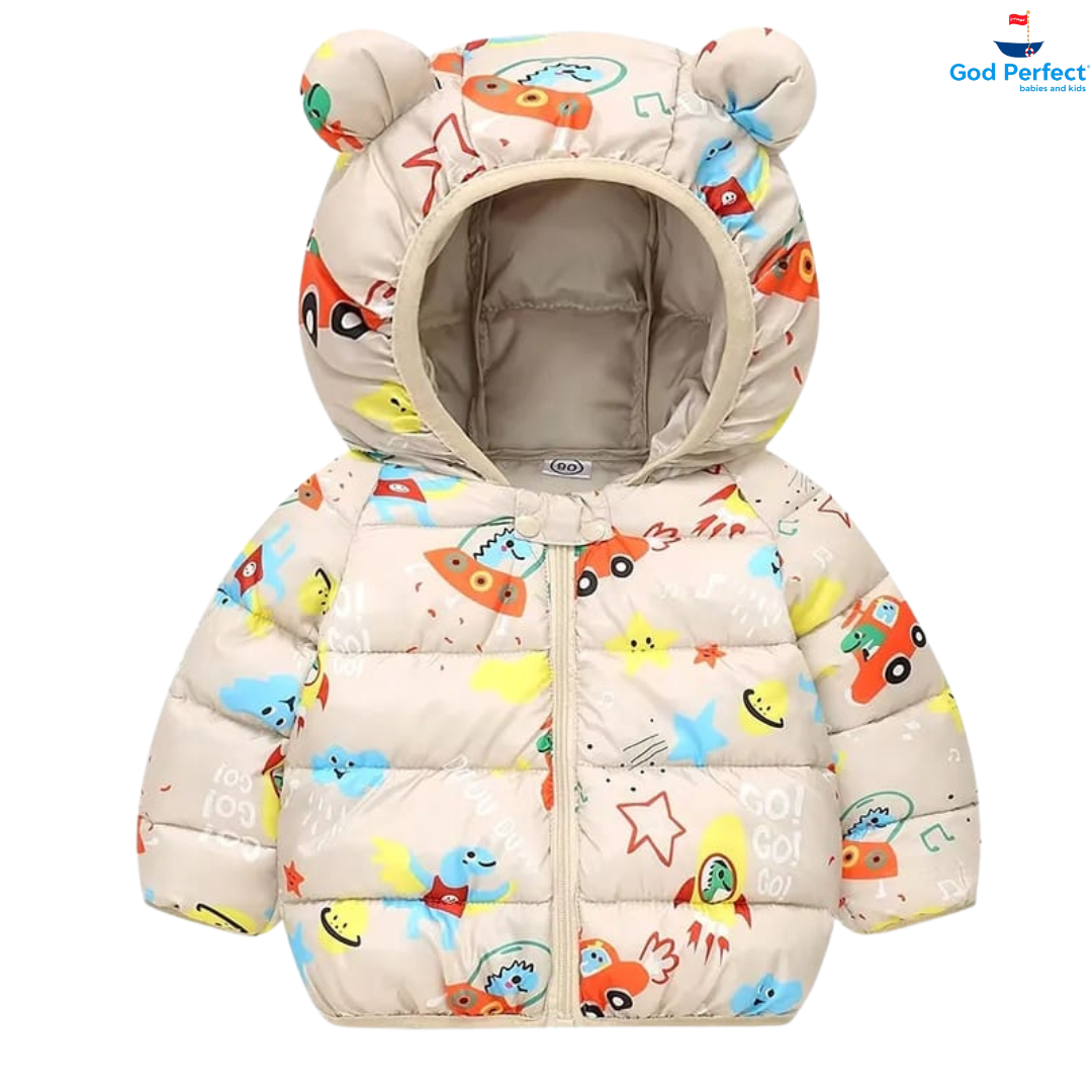 Chaqueta Impermeable Importada acolchada con cuello alto y capota, cierre de cremallera delante con protección para la barbilla con diseño en la capota .